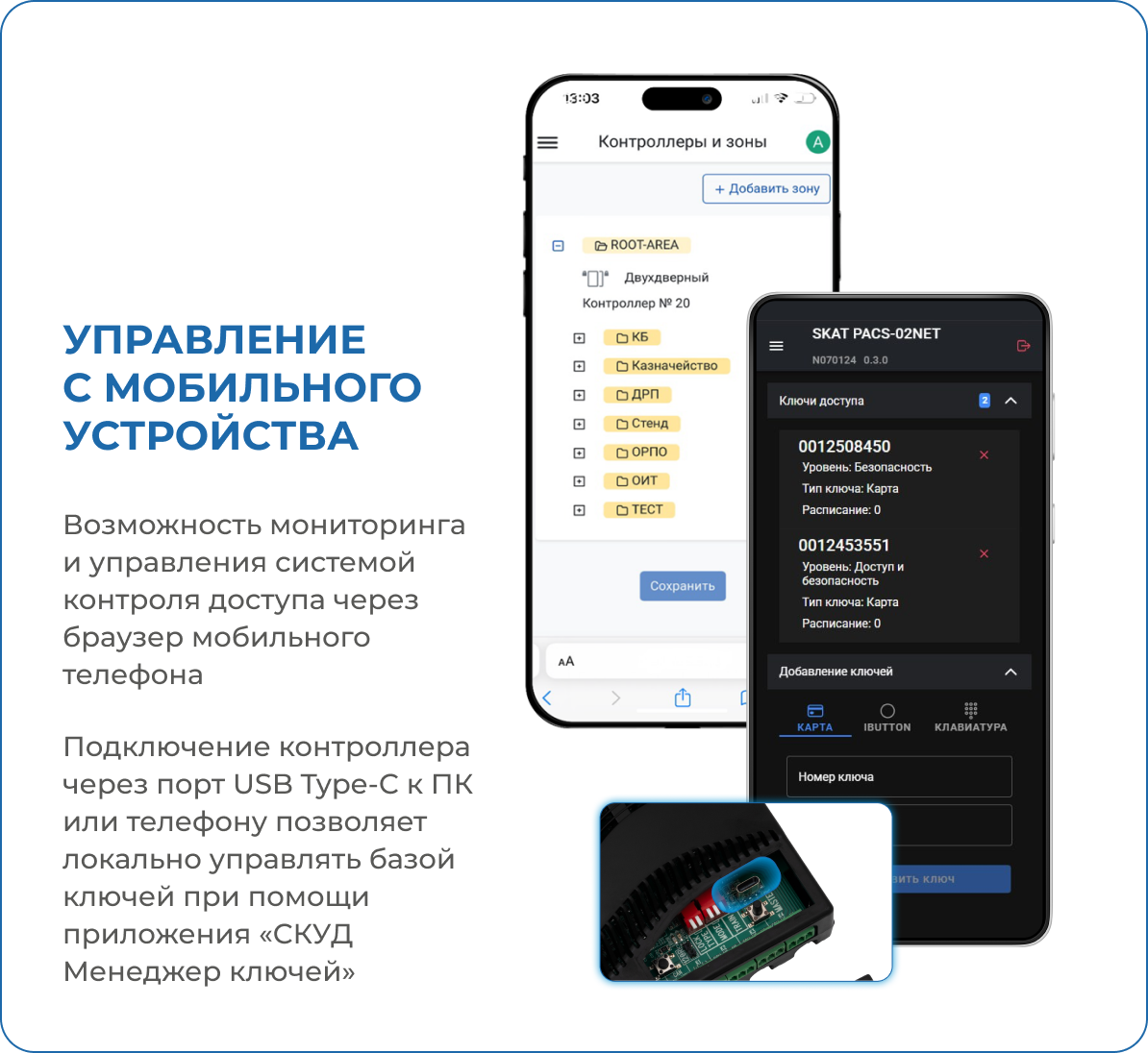 | Тип ключей, обеспечивающих доступ к контролируемой точке | Карта RFID, ключ ТМ, цифровой 4-значный код |