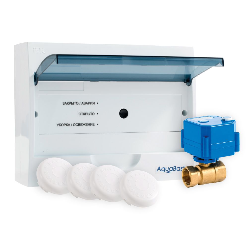 В комплект входит: Модуль управления системы AquaBast. Шаровой кран 3/4" с электроприводом, 12 В. 4 Датчика протечки. Контроль датчиков протечки и выдача управляющего сигнала на перекрытие кранов в случае аварии (4 зоны контроля). Встроенный аккумулятор на 48 часов резервного питания. Управление одной кнопкой, светодиодная индикация режимов работы, энергосберегающий режим при работе от АКБ, интерфейс связи с пультом управления, звуковое и световое оповещение об аварии. Шаровой кран с электроприводом, 12 В. 3/4 дюйма, корпус латунь литье, ручное открытие / закрытие, индикатор положения крана.