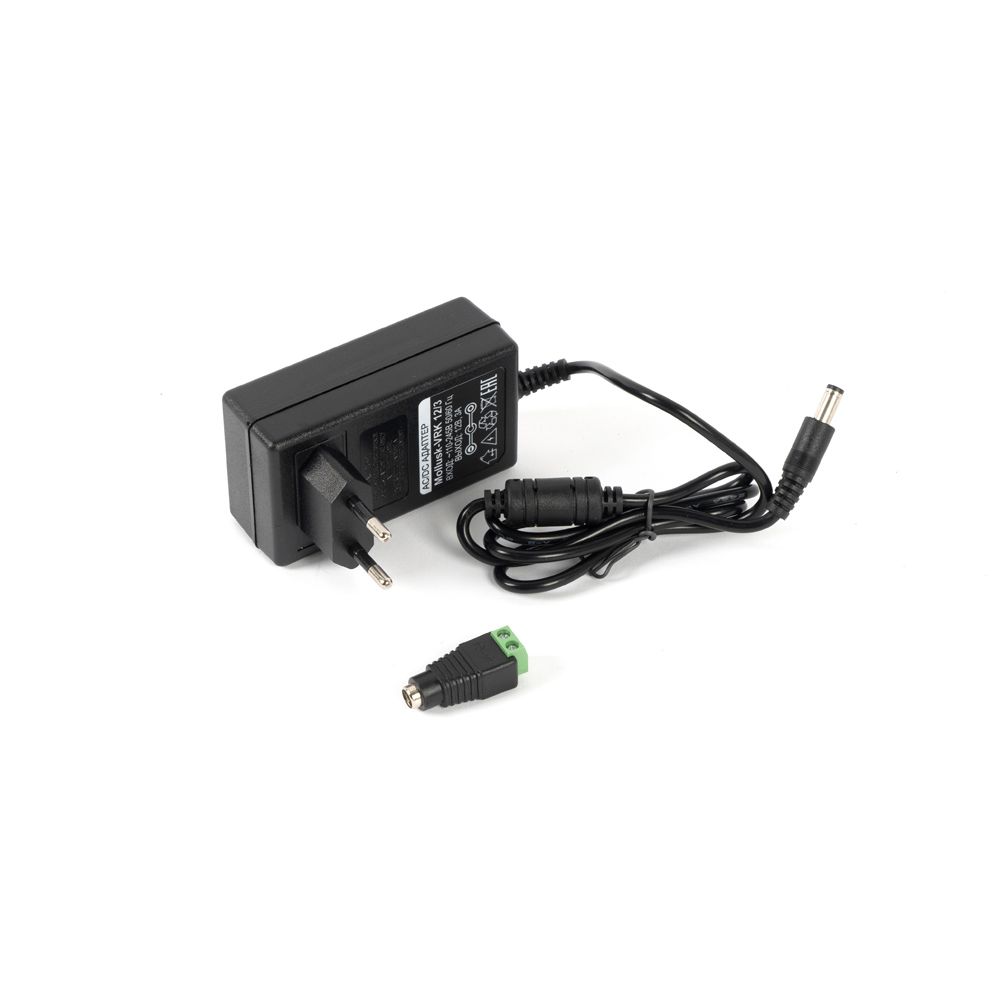 Изделие представляет собой источник питания постоянного тока без возможности организации резерва и подключения АКБ. Прибор работает от переменного входного напряжения в диапазоне от 110 до 240 Вольт. Блок питания выполнен ы компактном пластиковом корпусе. Подключение к сети электропитания осуществляется напрямую в розетку, дополнительных манипуляций с проводами при подключении не требуются. Видеокамера подключается при помощи стандартного штекера длиной 5,5 мм м шириной 2,1 мм. Для случаев, когда необходимо подключение нагрузки не оборудованной гнездом под стандартный штекер, в комплекте присутствует удобный переходник на клеммы. Компактные размеры корпуса позволяют легко разместить блок питания даже при дефиците свободного места на объекте. Для безопасной эксплуатации подключаемого оборудования в приборе предусмотрена защита от короткого замыкания.