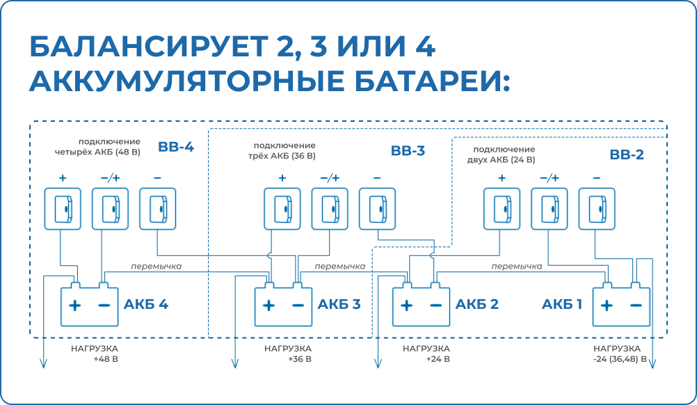 Применение SKAT BB-4 (26-200) Ah позволяет продлить срок службы АКБ за счёт автоматического выравнивания напряжения на клеммах АКБ.