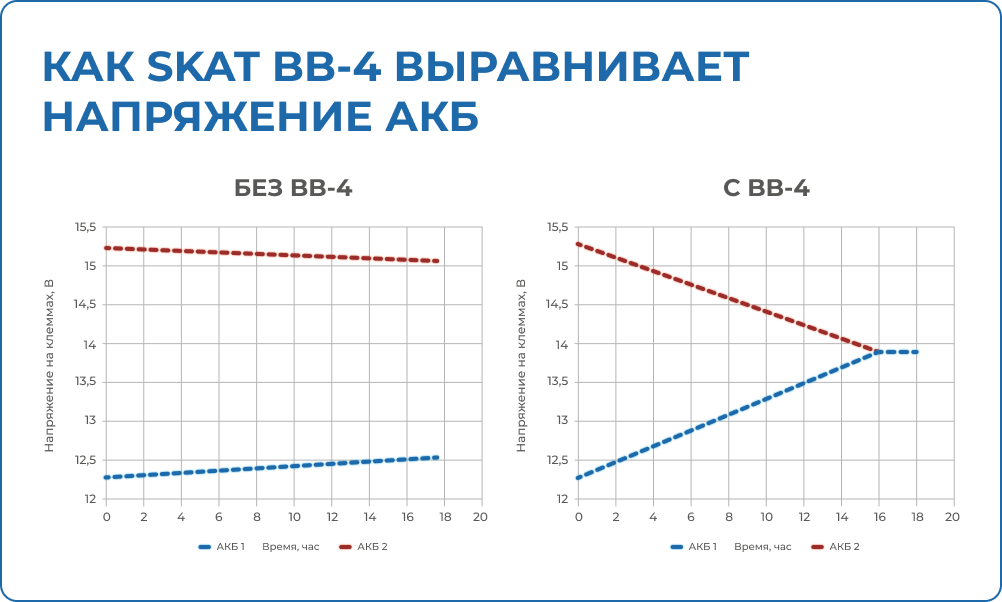 На рисунке 2 изображено сравнение изменения напряжения на клеммах АКБ1 и АКБ2 с течением времени – с использованием SKAT BB-4 (26-200) Ah и без него.