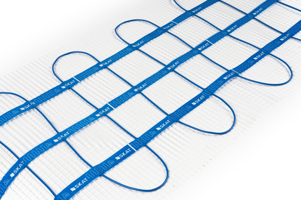 Электрический теплый пол SKAT HT MAT PRO состоит из отрезка тонкого двухжильного нагревательного кабеля, уложенного змейкой и закреплённого на стеклосетке. Нагревательный кабель с одной стороны замуфтирован, с другой соединён с силовым шнуром посредством опрессовки. Место соединения силового шнура и нагревательного кабеля герметично закрывается соединительной муфтой. Температура на оболочке нагревательного мата +47°С (при температуре окружающего воздуха +20°С).