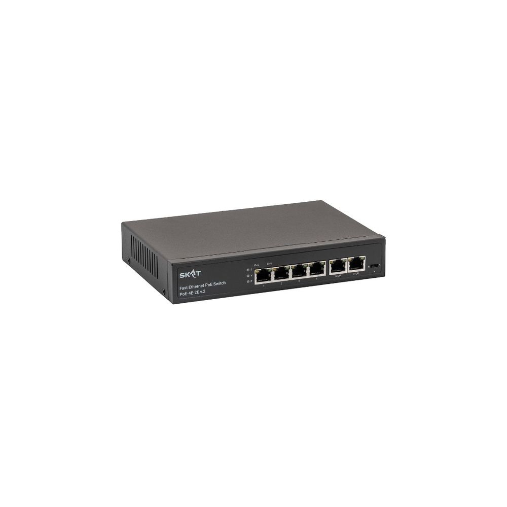 SKAT PoE-4E-2E v.2 представляет собой специализированный неуправляемый PoE коммутатор для использования в системах видеонаблюдения и безопасности. Характеризуется высокой надежностью работы благодаря защите от электростатических разрядов и перепадов напряжения, позволяет организовать качественную передачу информации в сети Ethernet.