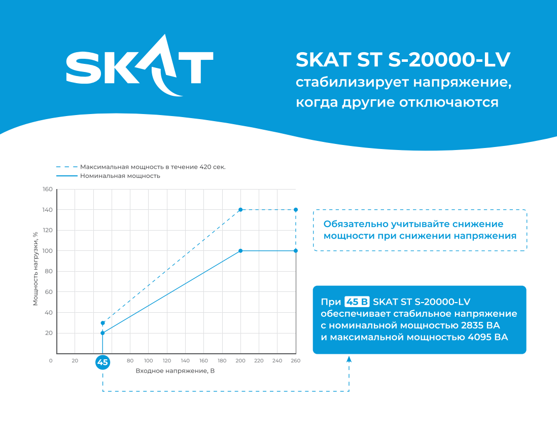 Стабилизатор SKAT ST S-20000-LV – надежное решение российских инженеров для защиты сети от перепадов, скачков напряжения и продления срока службы электроприборов. Главная особенность данного прибора – работа в условиях аварийно-низкого напряжения (от 45 В).
