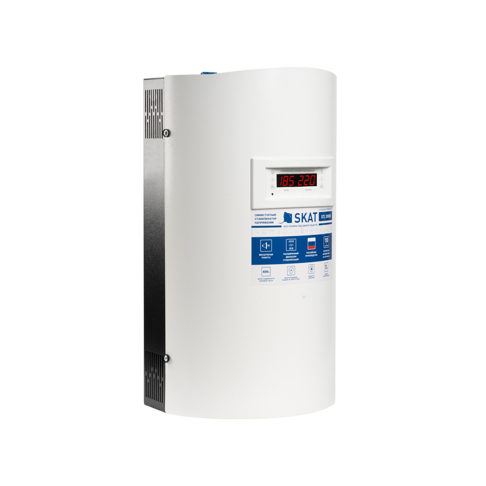 SKAT STL-20000 исп. Н – стабилизатор напряжения с симисторными ключами управления. Качественная элементная база, цифровая индикация, безопасное подключение и революционная форма корпуса.