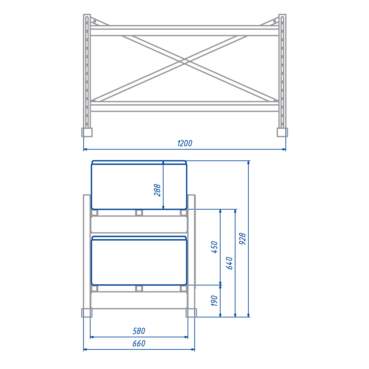 Сборно-разборный стеллаж SKAT SBR-125FT-10-1-2 предназначен для компактного размещения 20 фронт-терминальных свинцово-кислотных герметизированных аккумуляторных батарей емкостью 125 Ач.