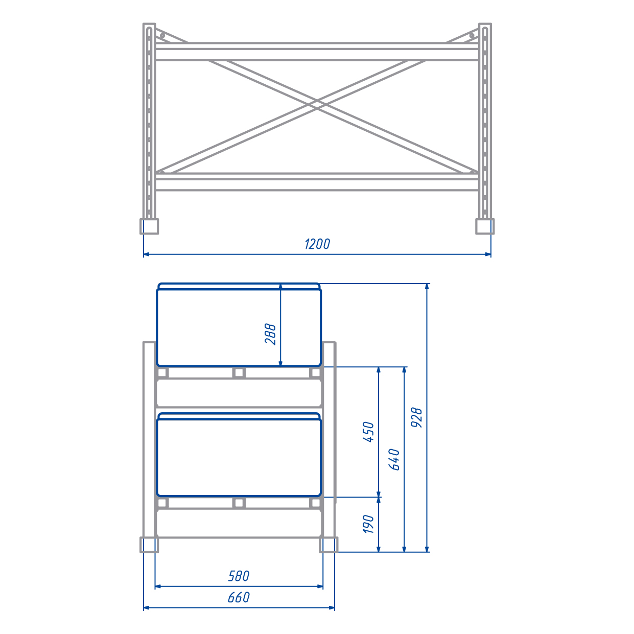 Сборно-разборный стеллаж SKAT SBR-80FT-10-1-2 предназначен для компактного размещения 20 фронт-терминальных свинцово-кислотных герметизированных аккумуляторных батарей емкостью 80 Ач.