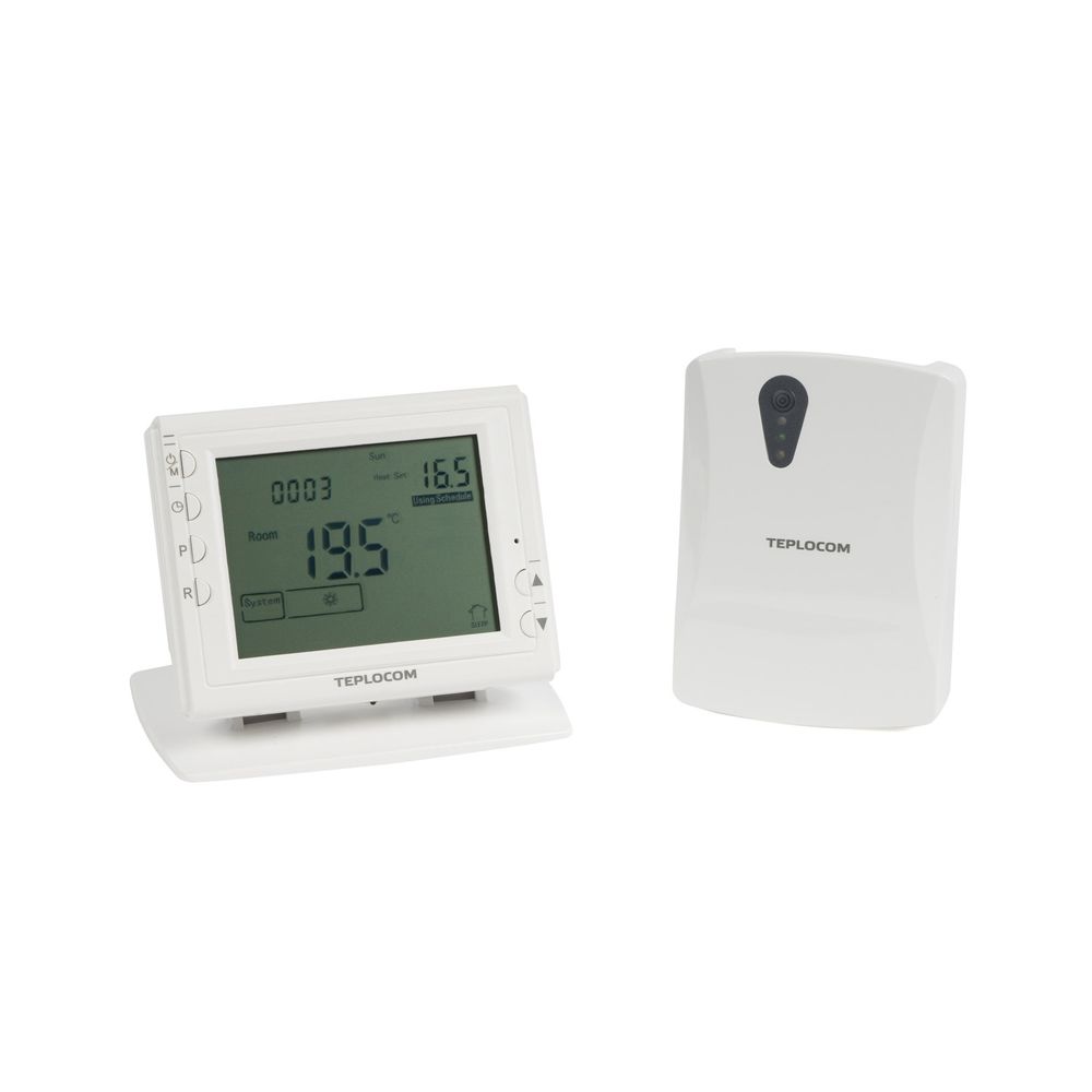 Беспроводной комнатный термостат TEPLOCOM TS-PROG-2AA/3A-RF состоит из термостата, который размещается в жилой комнате и приёмника, который устанавливается возле котла. Передача сигнала осуществляется по радиоканалу, а питание термостата при помощи батареек. К данному термостату не нужно прокладывать провода, поэтому его можно расположить в комнате, в любом удобном месте, это особенно актуально, если монтаж осуществляется после ремонтных работ в доме.